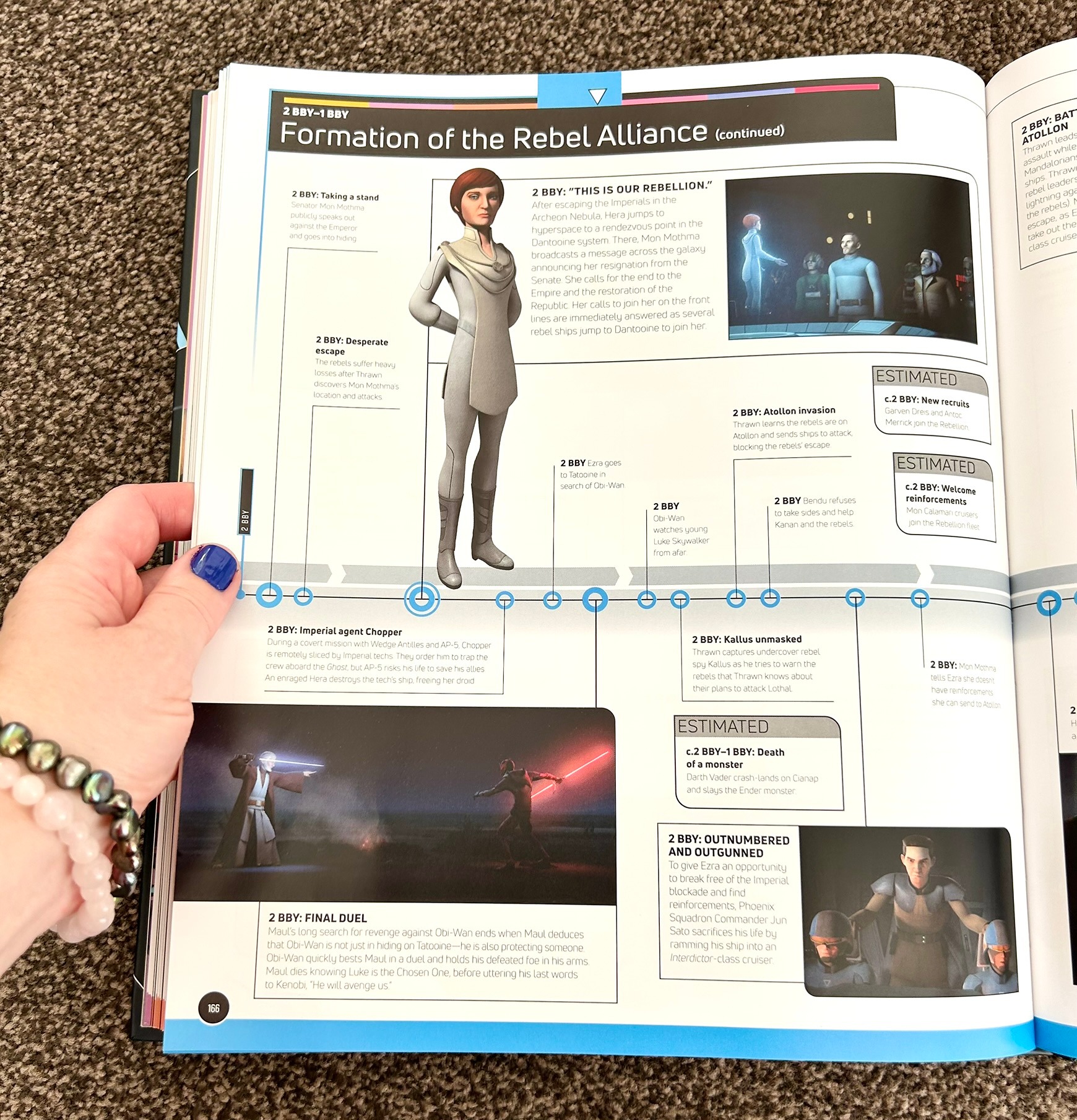 The book is divided into seven sections, each focusing on a specific era of the Star Wars story. As you read it, you follow a path which takes you through various events and when they happened. In the dating system, the years are labelled BBY (Before the Battle of Yavin) or ABY (After the Battle of Yavin). There are also pages dedicated to notable characters, groups and starships.